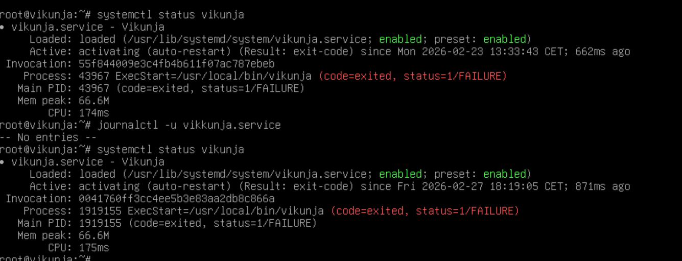 Try running /usr/local/bin/vikunja - that should print errors directly to the console.