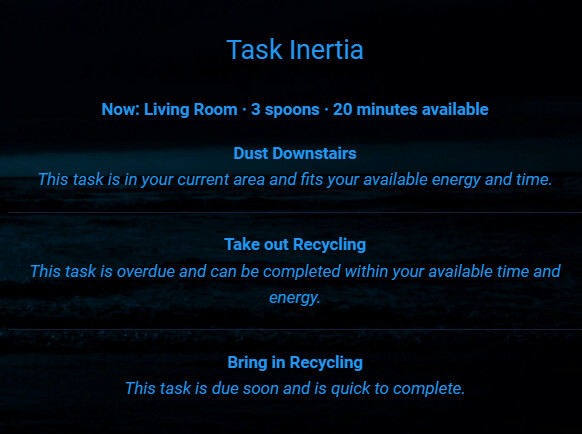 My self-hosted Vikunja gets pulled into Home Assistant (both via the “official” integration and via API) and the API in particular draws up a list of tasks to be analyzed by Google Generative AI to spit out to me the most appropriate tasks for me to consider doing based on my area (room and/or floor), spoons, and time available. All of those are tags; I’ve added a frequency tag as well but haven’t yet put that into play on the HA/AI side.