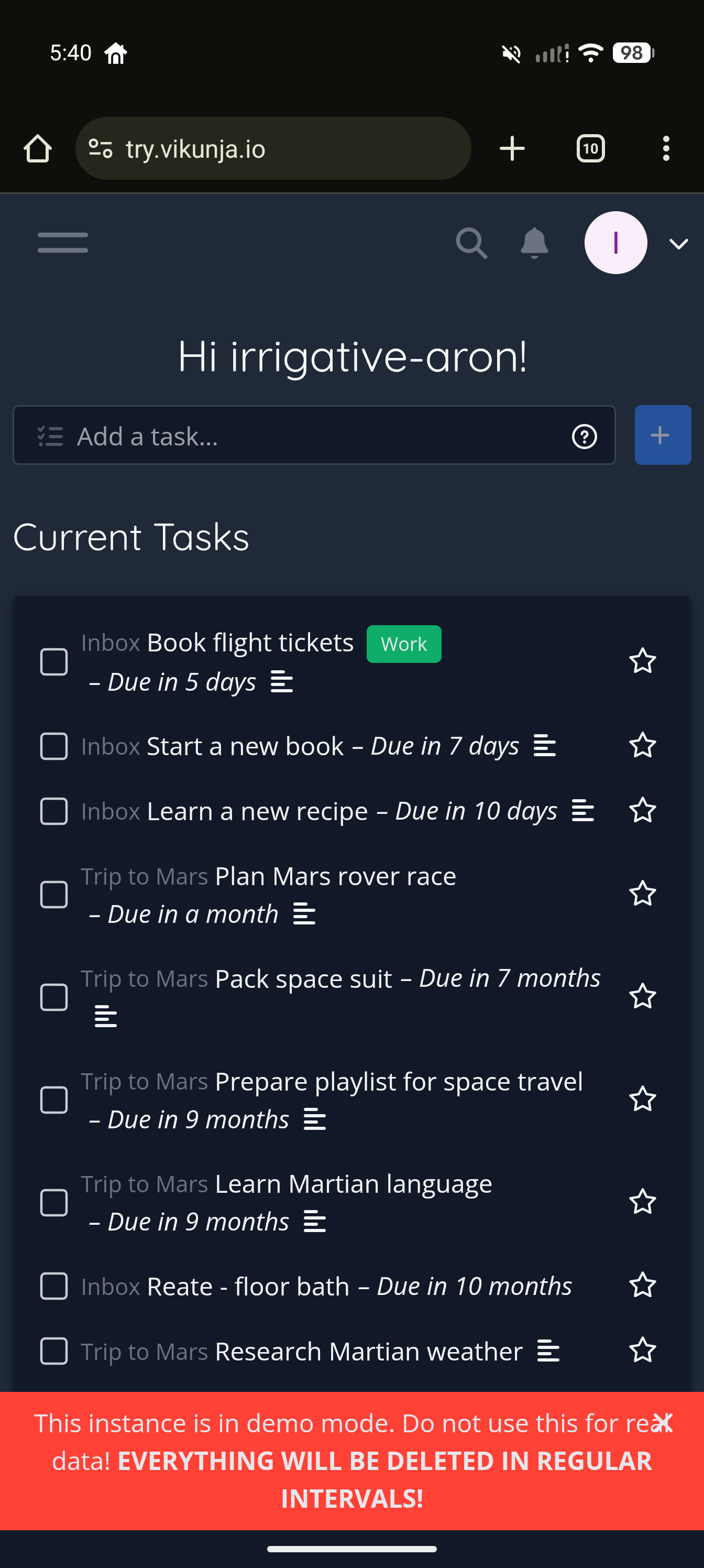 I ran the test again (in the demo) from my PC, like I did last night from mobile. Same result. I then tried to just create a task called ‘Renovate’. This did not get assigned a date and none of the letters in the title were removed.