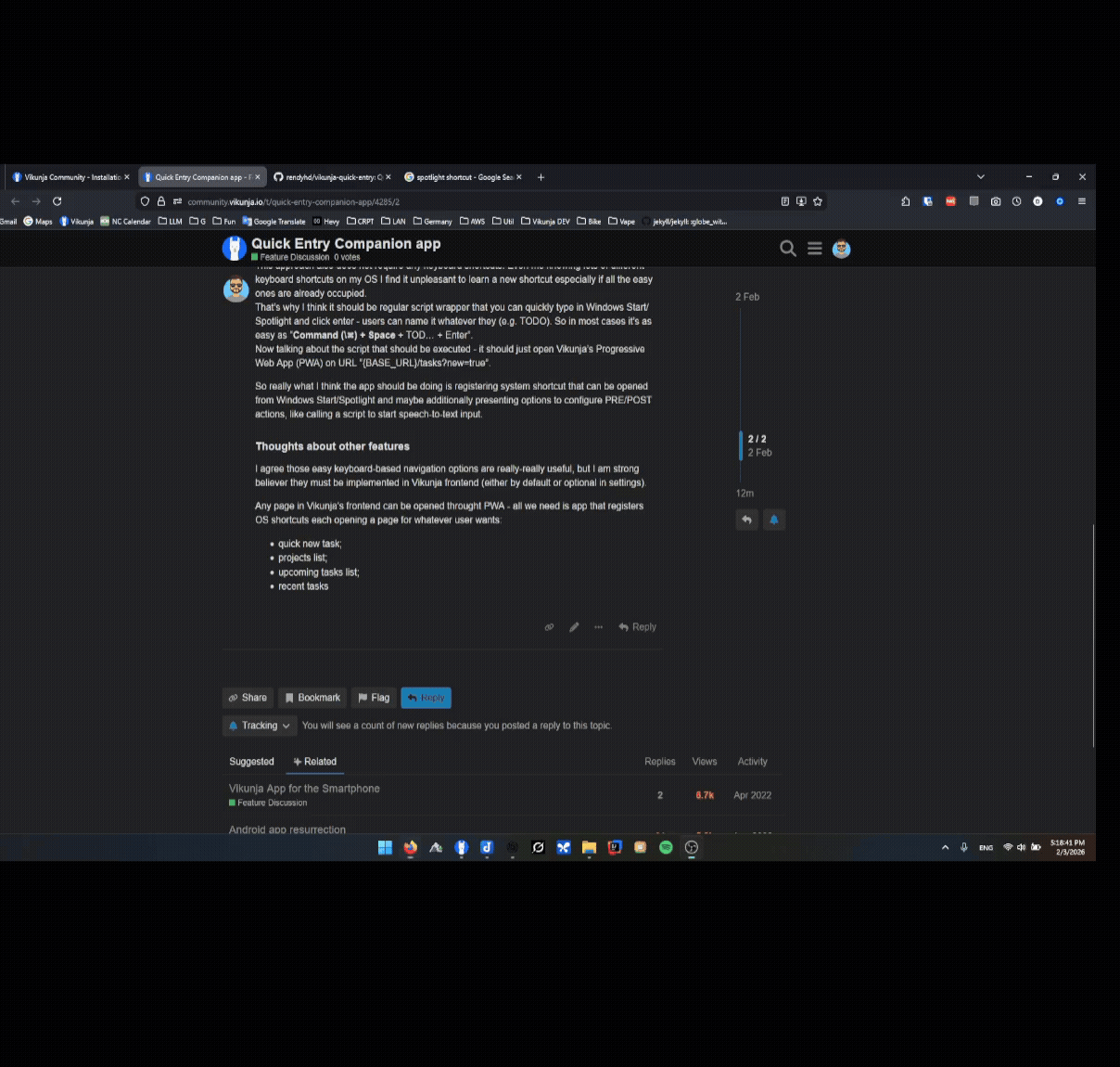 This one just creates empty task in Vikunja through API and opens FirefoxPWA at the URL of newly created task, then immitates keyboard shortcut that focuses on task description (I guess not there in Vikunja frontend but can be easily added), then immitates shortcut that starts speech-to-text recording in other app (Whispering).